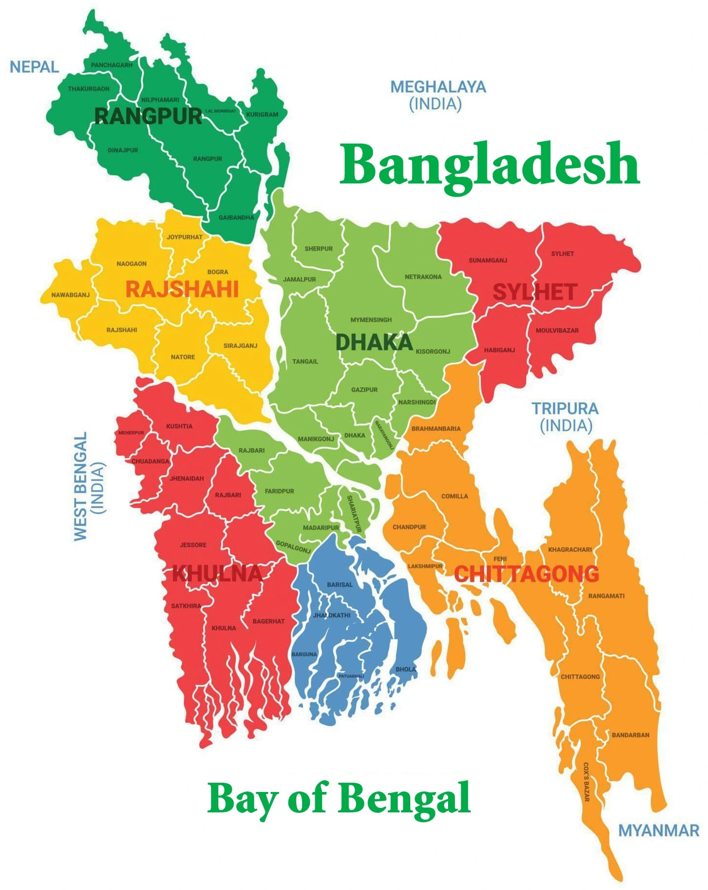 Geographically, Bangladesh is located in South Asia, between India and Myanmar. Its land area is 1,47,570 square kilometers (according to BBS 2020).